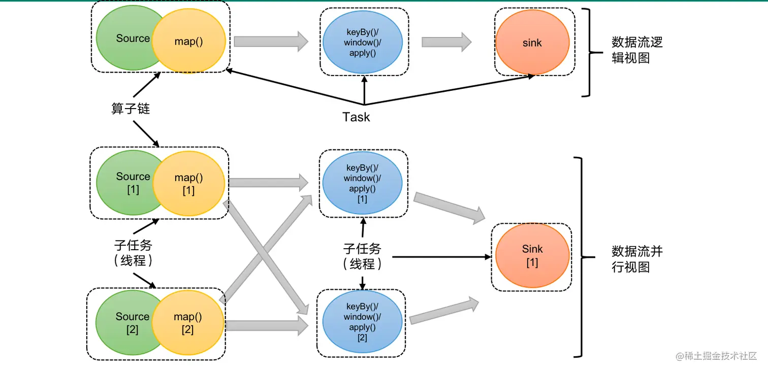 在Flink执行过程中,每一个算子(operator)可以包含一个或多个子任务(operator subtask),这些子任务在不同的线程、不同的物理机或不同的容器中完全独立地执行。