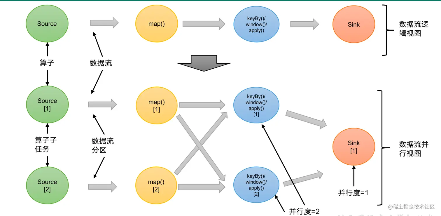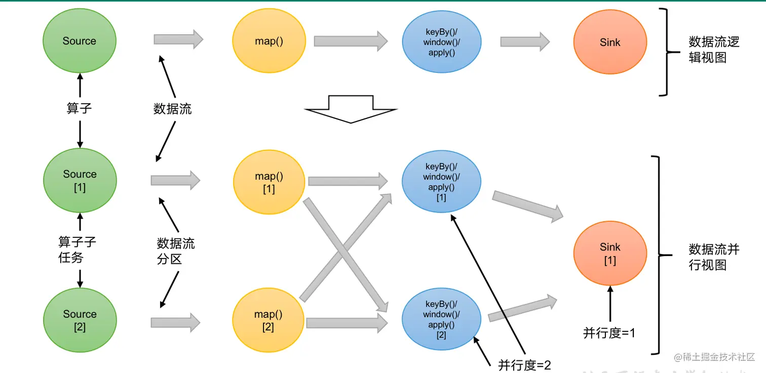 个数被称之为其并行度(parallelism)。 - 包含并行子任务的数据流,就是并行数据流,它需要多个分区(stream partition)来分配并行任务。