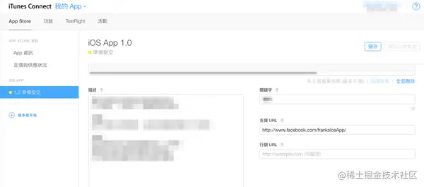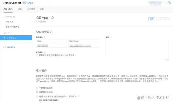 App Store -> iOS App -> XX准备提交-> 建置版本。点选「+」号,选取刚刚透过Xcode 上传的建置版本,点选「完成」