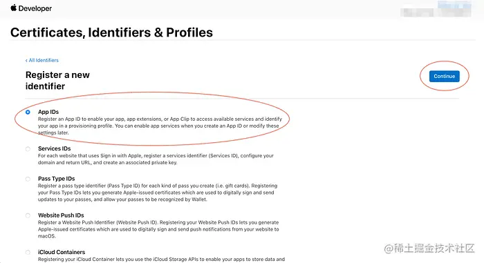 2.5 选取上一步骤所建立的App ID 后点选「Continue」