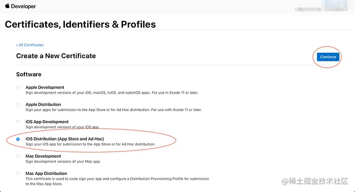 1.8 选取「iOS Distribution(App Store and Ad Hoc)」后,点选「Continue」继续下一步