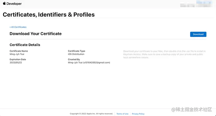 1.10 点选「Download」储存.cer 凭证档案后,确定已储存在本机后,点选「Done」完成