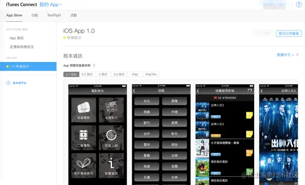 点选左侧的1.0 准备提交,这边会要求提供App 在各个装置的萤幕快照,此时则必须开启模拟器撷取各种设备的图。若只有上架到iPhone 就只需要准备iPhone 的图即可,图的尺寸则必须遵照以下网址内Screenshot Properties 提供的尺寸上传。