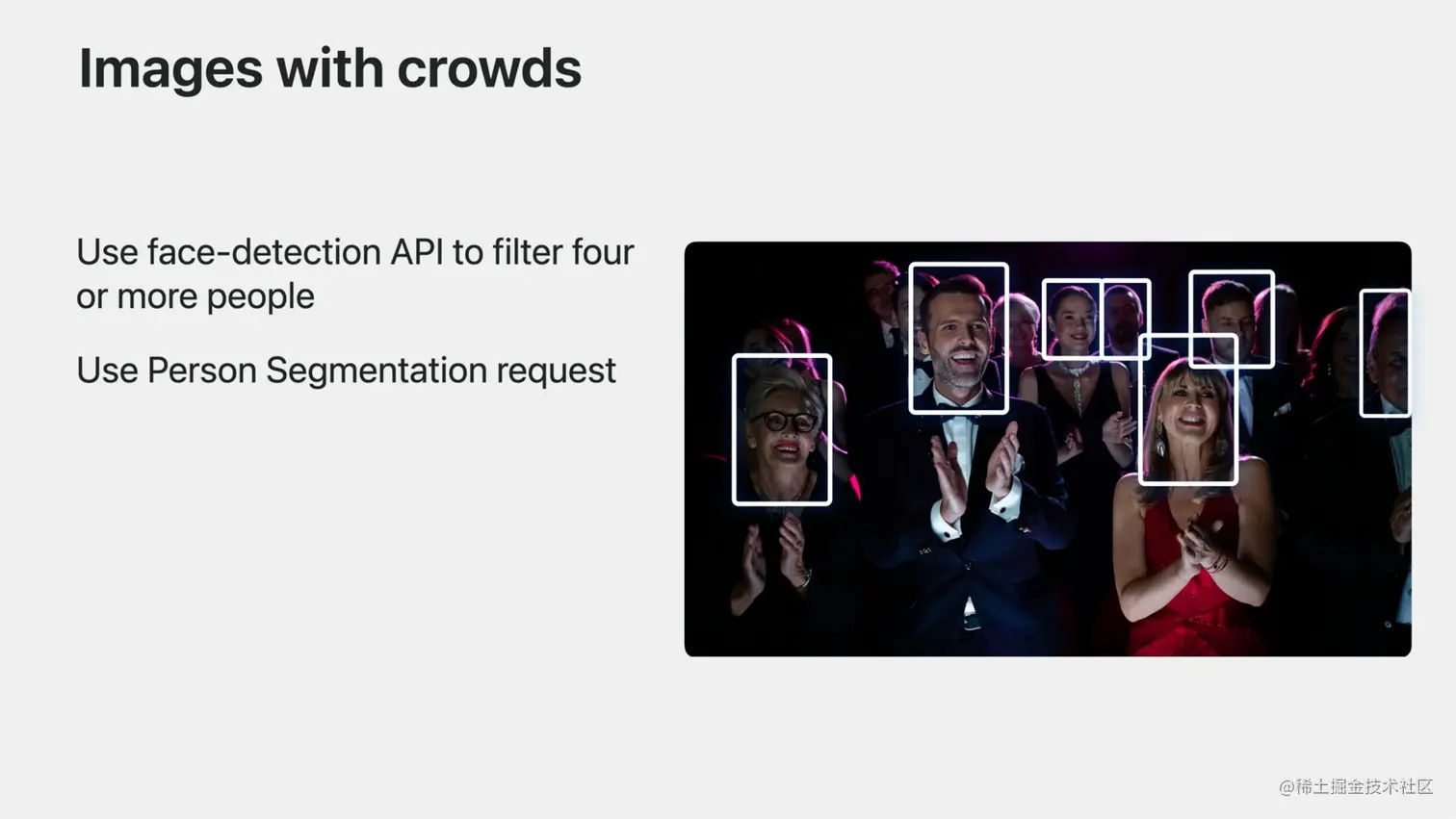 Vision现在可以与图像中的多个人物进行交互,提供了新的人物实例掩码请求API。新的人物实例掩码请求API可以输出最多四个单独的人物掩码,每个掩码都有置信度分数。当场景中有许多人时,返回的观察结果可能会有遗漏或将它们进行了合并。此外,Face-detection API可以用于计算图像中的人脸数量。