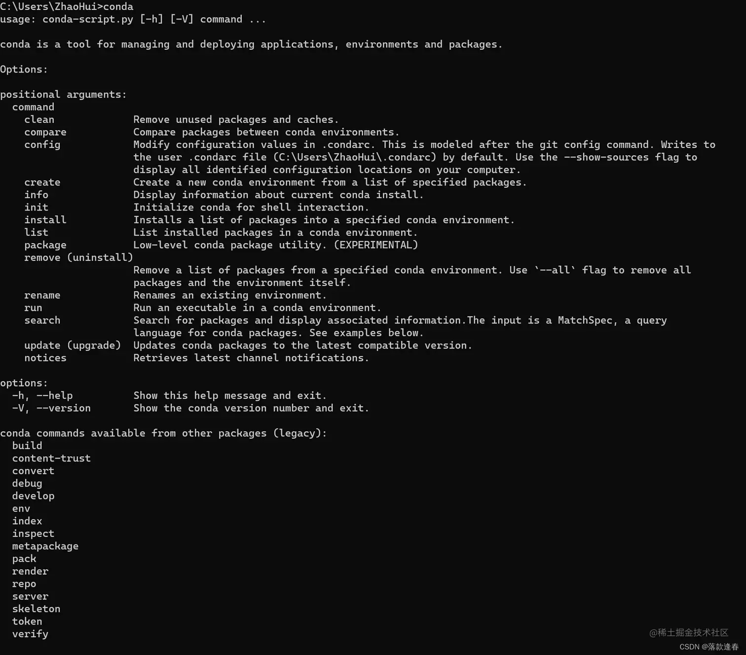 (4) 验证环境,打开DOS命令窗口(win+R),输入“cmd”运行,输入“conda”得到以下图结果即可说明配置成功: