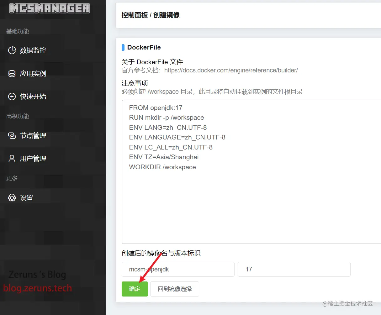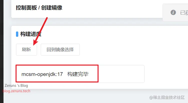 点击 新建镜像,接着点击 创建 OpenJDK 17 环境镜像(1.12.2及以下版本选JDK8;1.17及以上选JDK17)。