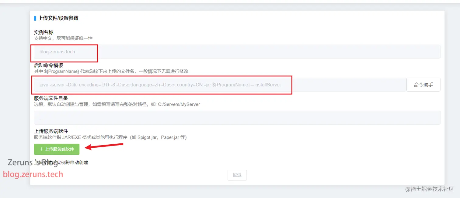 自己输入一个想设置的名称,启动命令输入 java -server -Dfile.encoding=UTF-8 -Duser.language=zh -Duser.country=CN -jar ${ProgramName} --installServer ,然后点下面的上传服务端软件选择上面下载的jar文件。