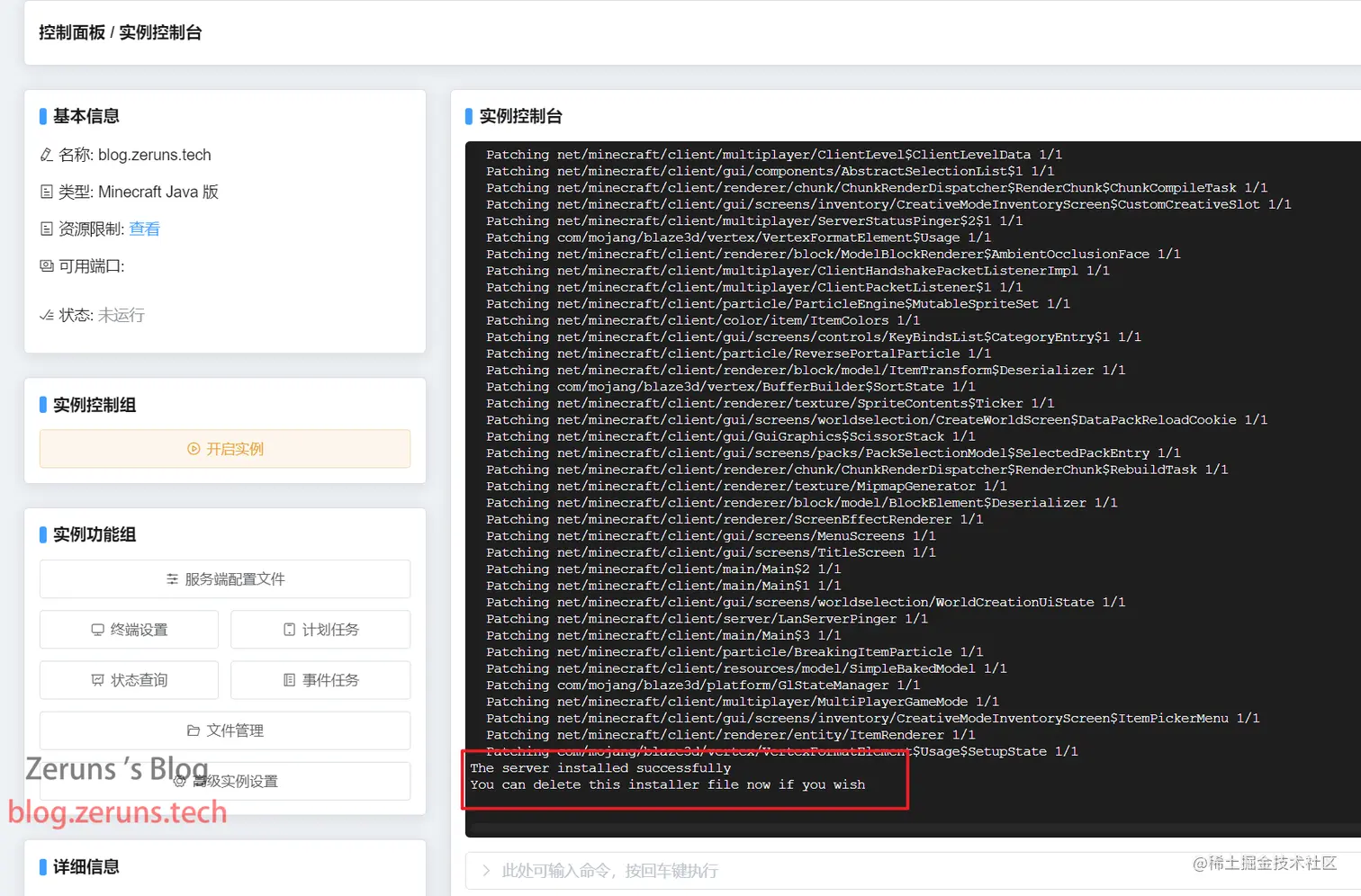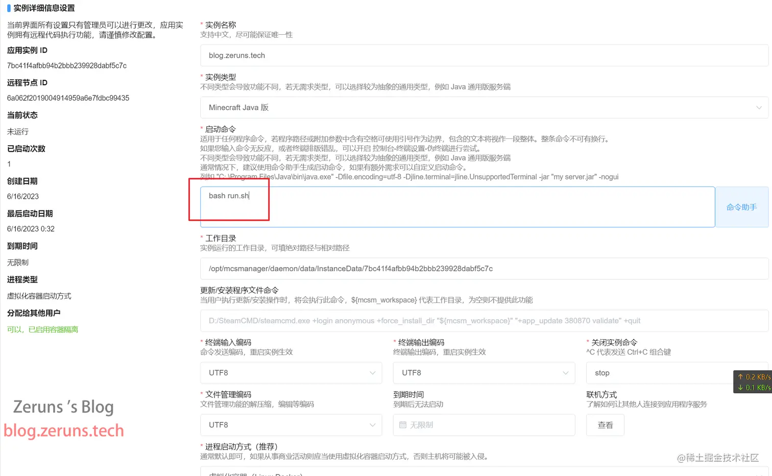 然后到高级实例设置那将启动命令改成 bash run.sh ,保存配置,回到实例控制台再次点击开启实例即可。