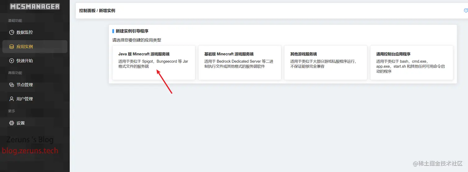 点击 应用实例→新建实例→Java版Minecraft服务端→上传单个服务端软件
