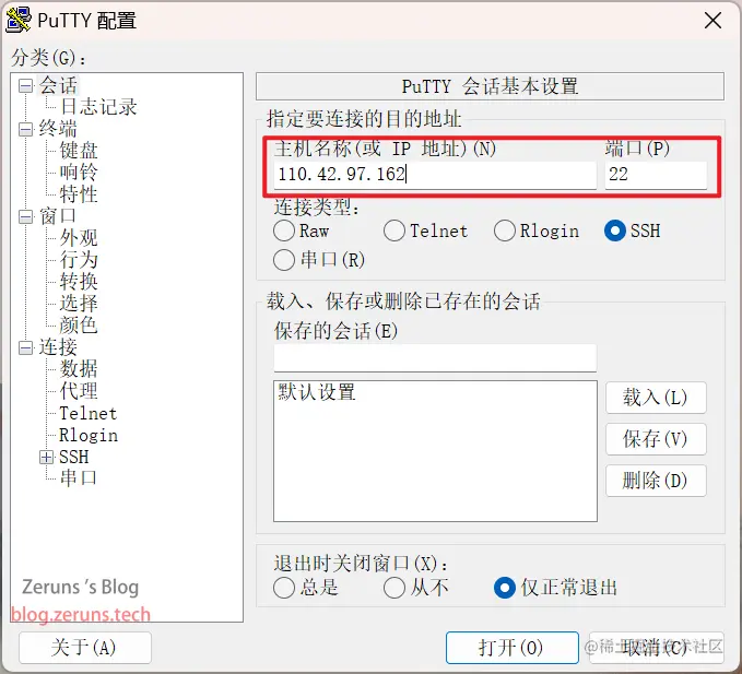在SSH客户端中输入你的服务器的IP地址或域名,还有SSH端口,然后点击打开。