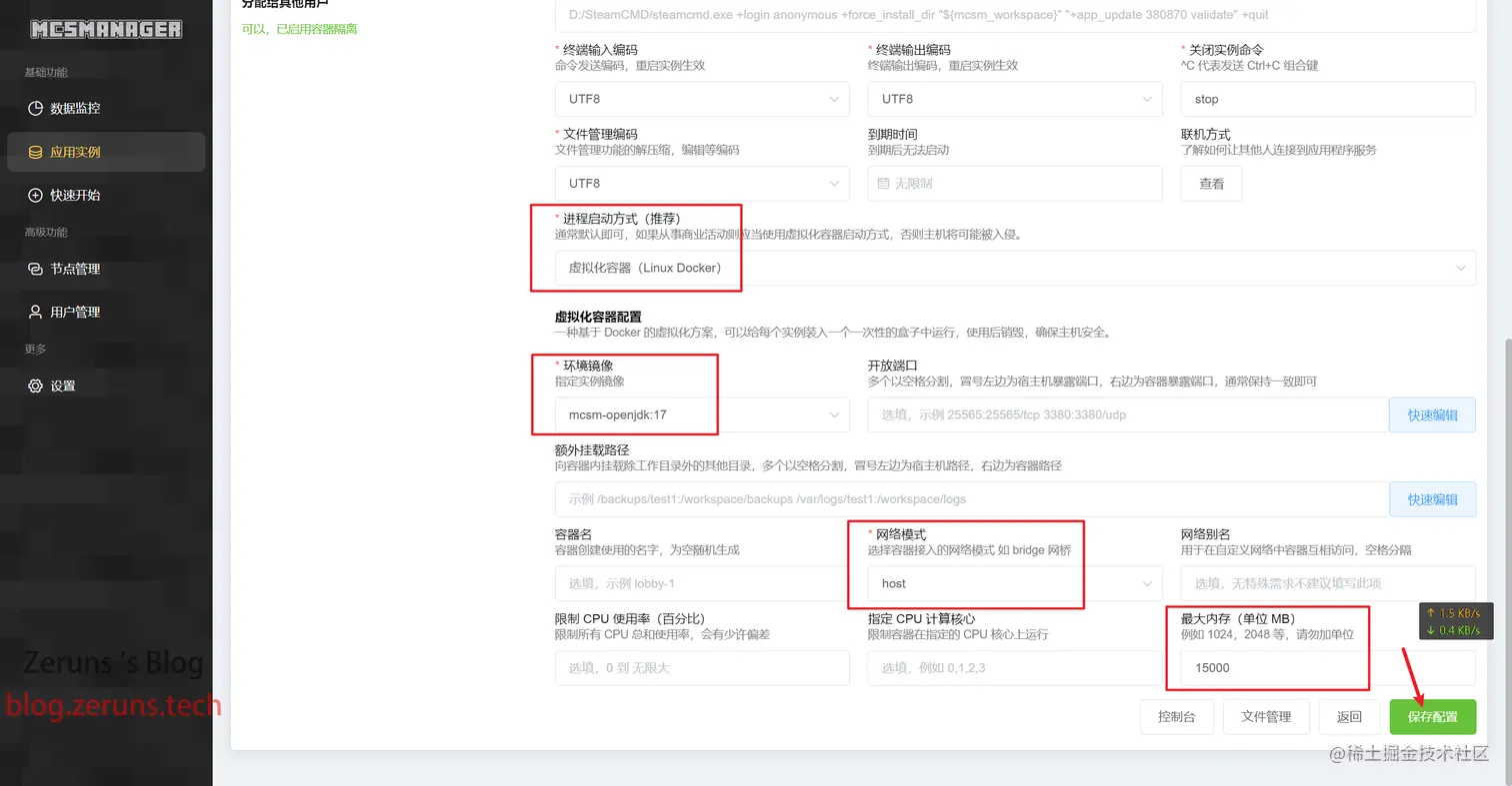 进程启动方式选择虚拟化容器,环境镜像选择mcsm-openjdk:17,网络模式选择host,最大内存根据自己服务器内存大小设置,建议设置比自己服务器内存小一点,留点空间给系统,设置完点保存配置,然后点控制台。