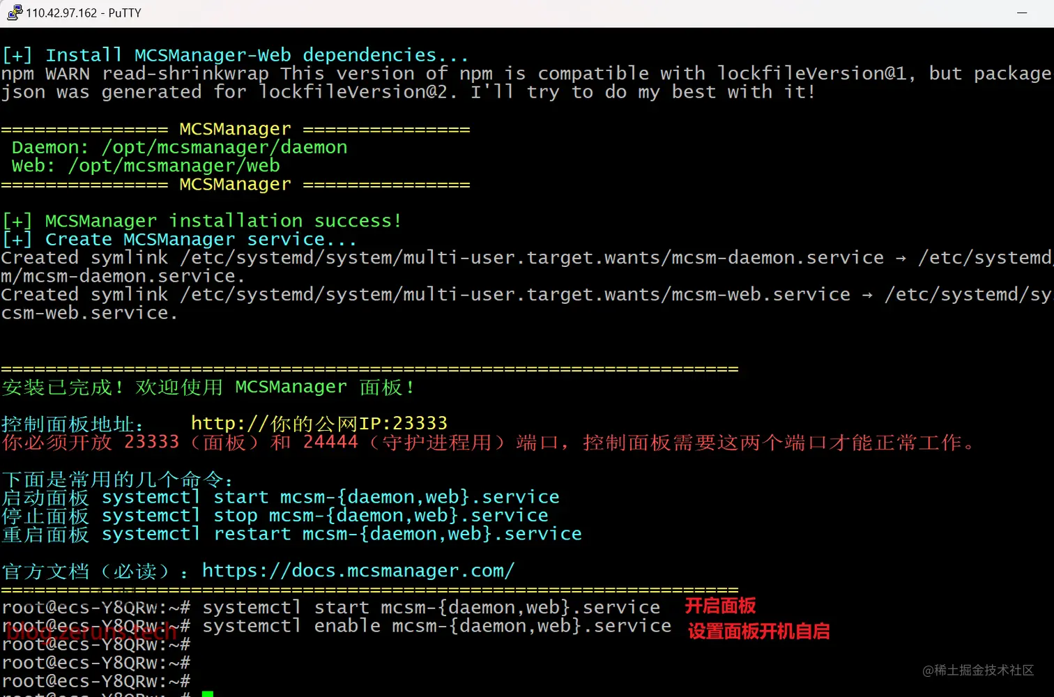 systemctl enable mcsm-{daemon,web}.service来开启开机自启 - 面板代码与运行环境自动安装在