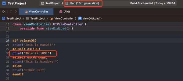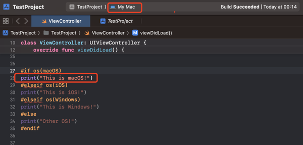 如果当前设备选择一个手机模拟器,则 print("This is iOS!") 高亮,如果选择 macOS 的模拟器,则 print("This is macOS!") 高亮。