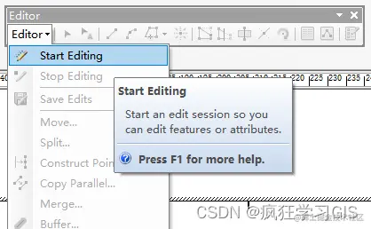 明确了需求,接下来我们就开始具体的代码实践。首先,我们将这一图层导入ArcMap软件,并通过“Editor”→“Start Editing”选项开启编辑模式,如下图所示。