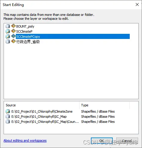 随后,在弹出的“Start Editing”窗口中,选择我们需要对其加以修改的矢量面要素。