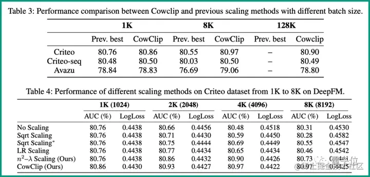 特别是在DeepFM上,通过将批大小从1K扩大到128K,CowClip实现了AUC超过0.1%的改进。