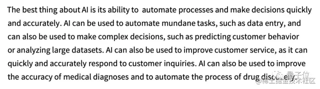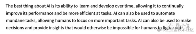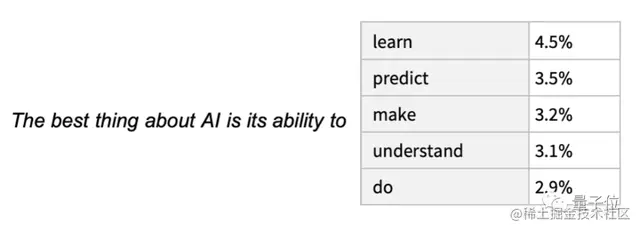 例如,我们输入了文本“AI 最好的事情是它的能力”,ChatGPT 就会在数十亿页的人类文本中查找类似文本,然后统计下一个单词出现的概率。需要注意的是,ChatGPT 并不是直接对比文字本身,而是以某种意义上的“意思匹配”为依据。最终,ChatGPT 会生成一个可能的单词列表,并给出每个单词的概率排名: