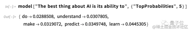 稍后,我们将深入了解这个神经网络,并讨论它是如何工作的。但目前为止,我们可以将这个“网络模型”作为一个黑盒应用到我们的文本中,并根据模型认为应该遵循的概率,请求前5个单词: