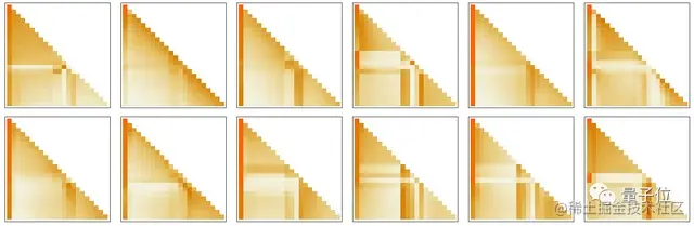 具体而言,attention head的作用是重新组合与不同token相关的embedding向量的块,并赋予一定的权重。因此,例如,GPT-2中第一个注意块中的12个attention head对于上面的“hello,bye”字符串具有以下(“回顾token序列一直到开头”的)“重新组合权重”模式:
