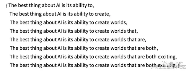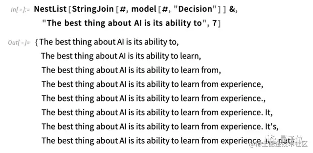 下面是重复 “应用模型 “的情况—在每一步中加入概率最高的词(在此代码中指定为模型中的 “决定”):