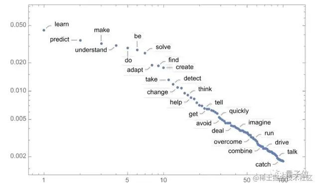 值得指出的是,即使在第一步,根据已有的文本,也有很多可能的“下一个词”可供选择(在温度为0.8的情况下),尽管它们的概率很快就会下降(是的,在这个对数图上的直线对应于一个 n–1 的“幂律”衰减,这是语言的一般统计特征):
