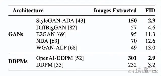 不仅如此,经过研究对比,扩散模型从训练样本中“抄袭”的能力是GAN的2倍,且生成效果越好的扩散模型,记住训练样本的能力越强。