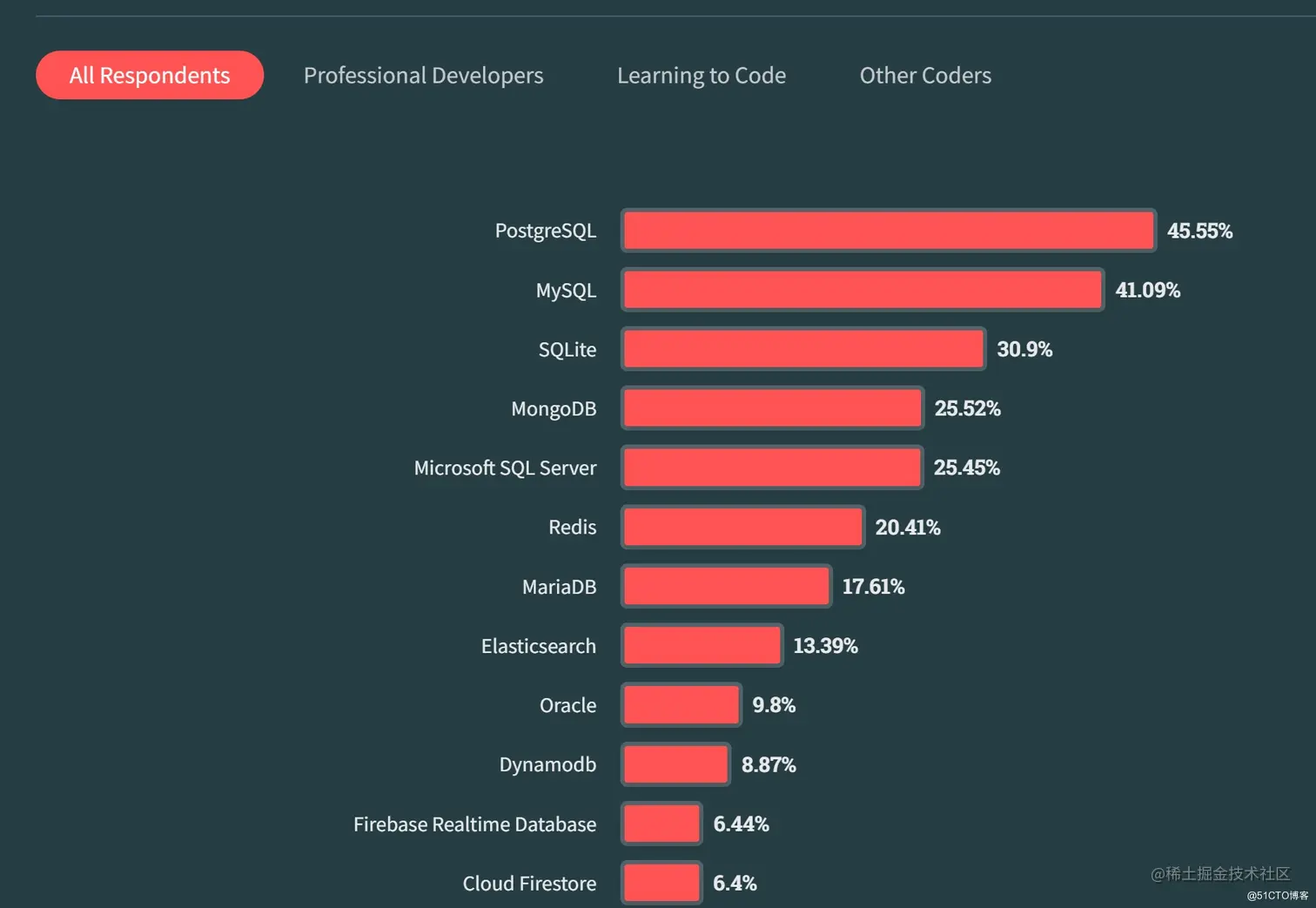 2023 年 5 月的调查由开发人员问答网站 Stack Overflow 进行,有 45.55% 的受访者使用 PostgreSQL,而 MySQL 和 SQLite 分别为 41.09% 和 30.9%。