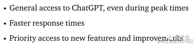 官方公告里,ChatGPT Plus版还能在使用高峰期任意访问ChatGPT,之后升级、开放新功能,也是付费用户先体验~