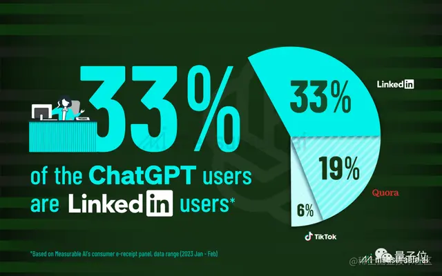 其中,Facebook拔得头筹,有约35.6%的ChatGPT用户在此冲浪;其次是领英,该平台专业用户占ChatGPT用户总数的33%。接着是Twitter用户约占26.4%;Quora用户约占19%。