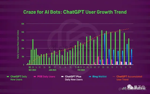 值得一提的是,今年二月确实发生一系列重要事件,2月7号微软“重新发明搜索引擎”,推出ChatGPT版bing,很快便有一大波人来申请新版Bing,ChatGPT注册人数也跟着涨了一波。