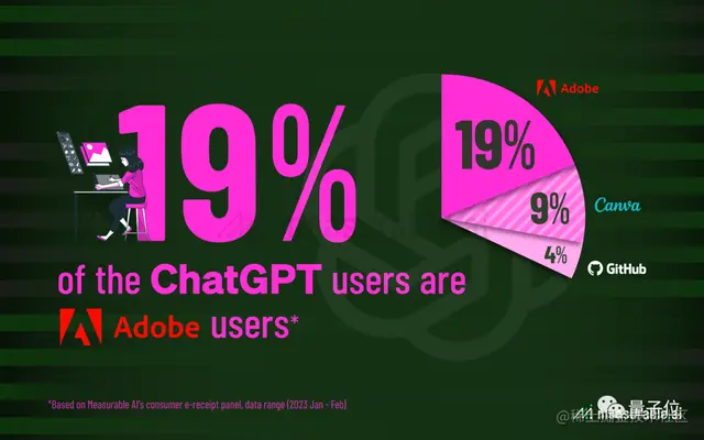 结果显示,用Adobe的人占ChatGPT用户总数18.5%,然后是用Canva的,约占9.2%;这两个软件都是设计者的绘图宝贝。