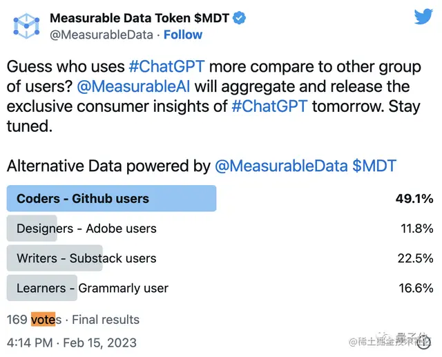 为了了解大家的想法,他们在公布数据前,还跑到Twitter发起投票。结果,当时大多数人都认为开发人员应该是ChatGPT的主要用户。(好家伙,和统计结果截然相反)