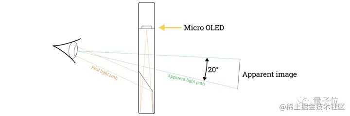 显示器这边,Monocle使用的是索尼ECX336CN微型OLED,像素是640x400RGB,与主机壳光学连接,这样一来,便能将图像导向用户的眼镜(光路图如下)。