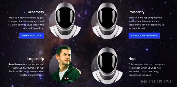 本次宇航员选拔有四个席位,分别代表「领导、希望、慷慨和繁荣」。
