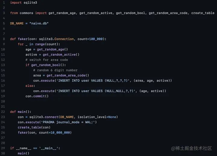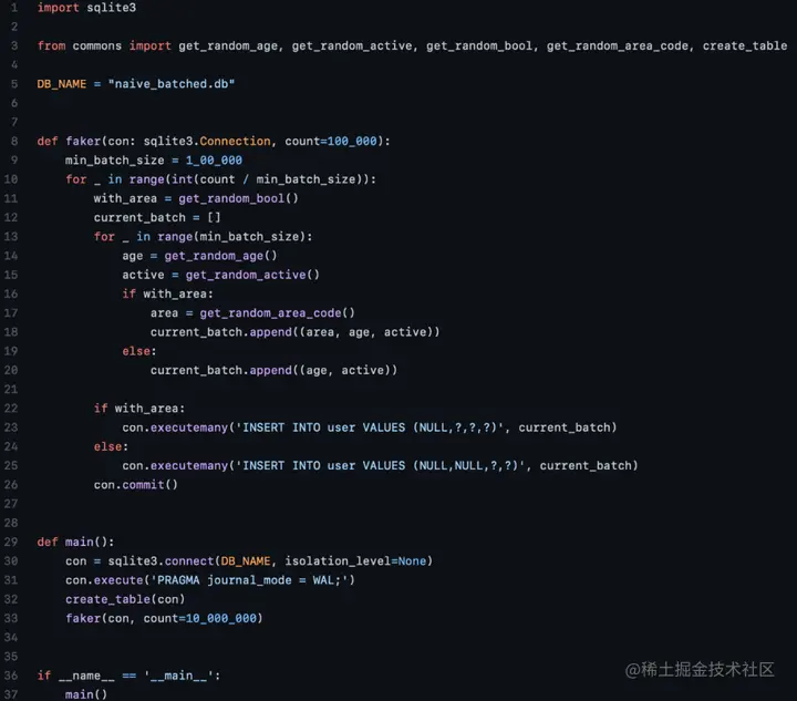 在最开始的脚本中,作者试图在一个for循环中逐一插入1000万条记录,而这让用时直接达到了15分钟。