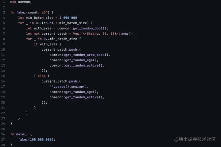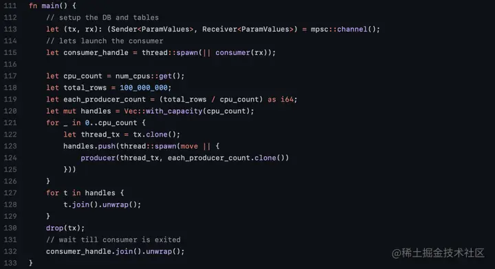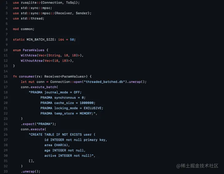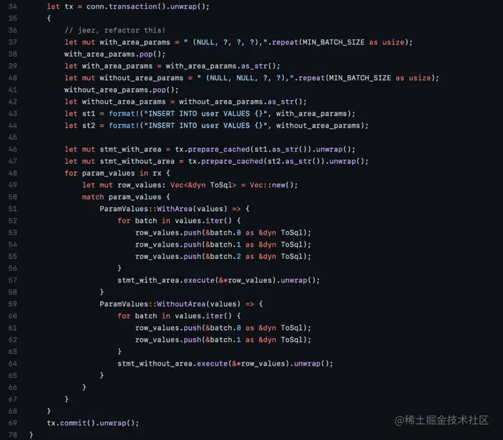 像Python一样,作者先写了一个原始的Rust版本,一个循环执行一行数据的插入。