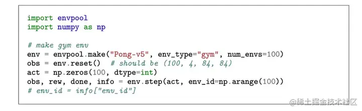 对于研究人员来说,EnvPool提供了方便易用的Python接口,如下图所示,最简单的同步执行模式的接口与Gym API完全一致,相比单环境的gym/dm_env, EnvPool仅仅将原本与单个环境交互的API拓展到批量交互。