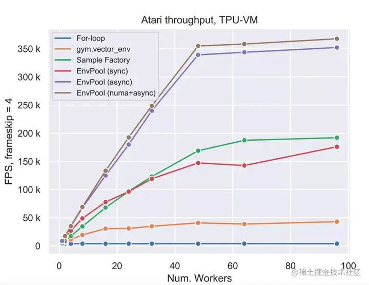 Sea AI Lab的研究员在两种不同的机器型号上评测对比了EnvPool及别的RL环境执行引擎的吞吐量,分别是TPU v3-8虚拟机, 以及NVIDIA DGX-A100机型。TPU虚拟机上有96 CPU cores,两个NUMA节点,一台NVIDIA DGX-A100机子有256 CPU核, 8 NUMA nodes.