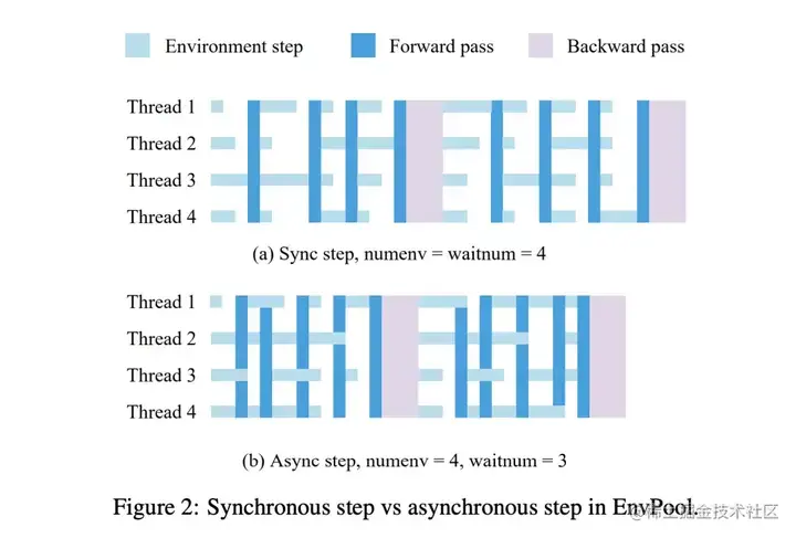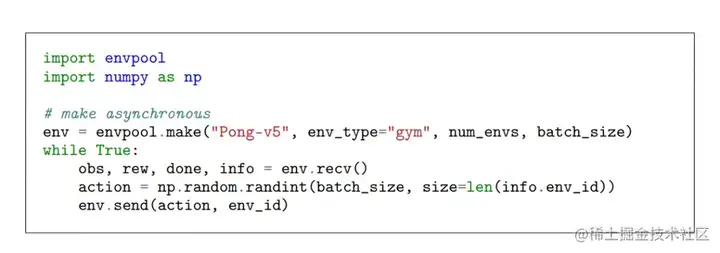 在异步模式下,EnvPool将原有的step函数拆分成send和recv函数,在调用send函数将action送往环境之后,线程无需等待当前交互的环境返回新的state,而是交由EnvPool在线程池中执行。