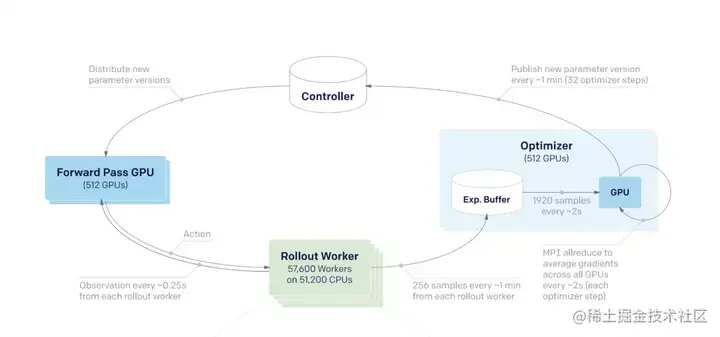 世界上目前最大型的强化学习训练系统都是采取分布式训练方法,比如OpenAI Five,使用了超过5万核CPU,以及上千个GPU来进行训练。