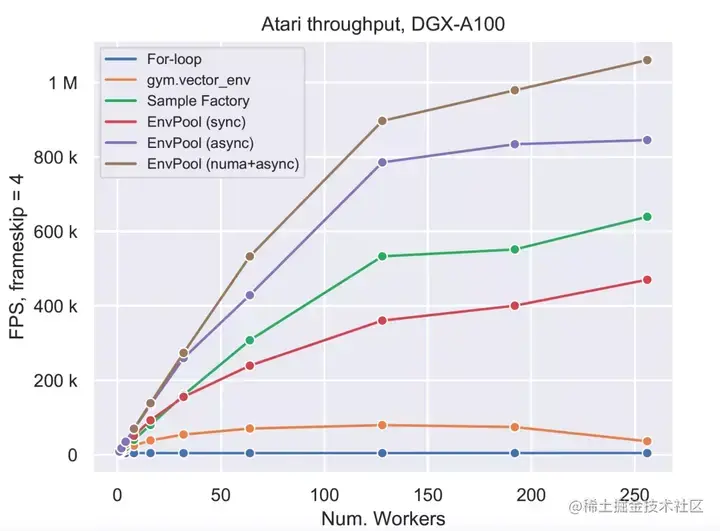 这个RL环境引擎底层使用C++线程池,通过异步的方式执行多个RL环境实例,来大大加速并行的效率。EnvPool在经典的RL环境模拟器Atari游戏上,利用起NVIDIA DGX A100单机上的256个CPU核,达到了惊人的一百万帧每秒的执行速度。