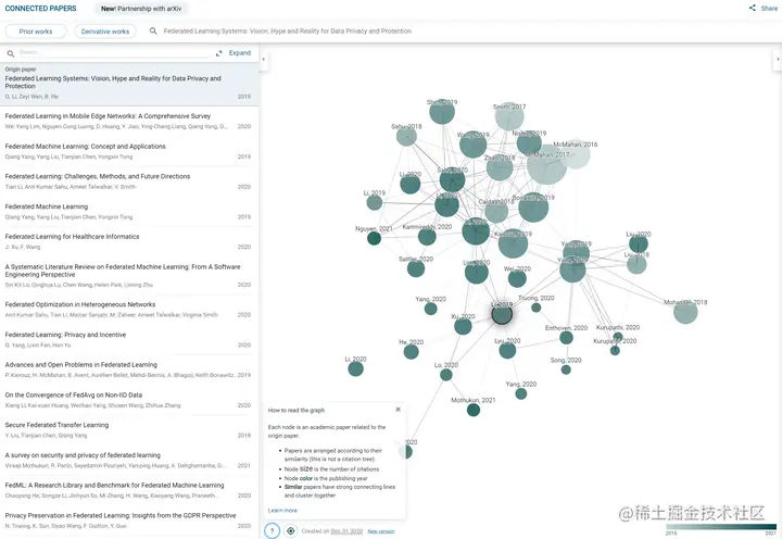这里能看到,颜色深浅代表年度近远,圆圈大小代表引用次数多少,而圆圈之间的连线代表文章的相似程度。