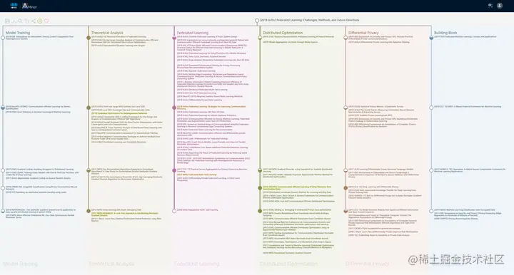 这里横向将参考文献根据各个领域进行了聚合,纵向根据年度将文献进行了拆分和聚合。然后文献左侧的圆圈水位深浅代表了文献的重要程度,黄色强调标记的是最重要的几篇文献。