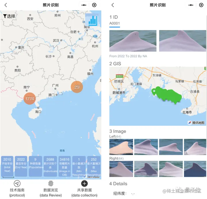 小程序数据库中有超过36700张白海豚背鳍照片,通过AI进行识别,最后确定了超过2700头个体。(辨别中华白海豚的关键就是通过它的背鳍)。如果公众自己拍到了海豚照片,还能通过小程序上传,用AI确定它是否是中华白海豚。目前单张照片识别准确率达到93%以上,从上传照片、处理到反馈结果,整个过程仅需要10秒。