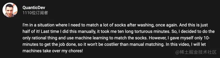 「我决定做一件唯一合理的事,用机器学习来匹配袜子。我只给了自己10分钟的时间来完成项目,所以它不会比亲自动手匹配更昂贵。在这个视频中,我会让机器接管我的家务!」