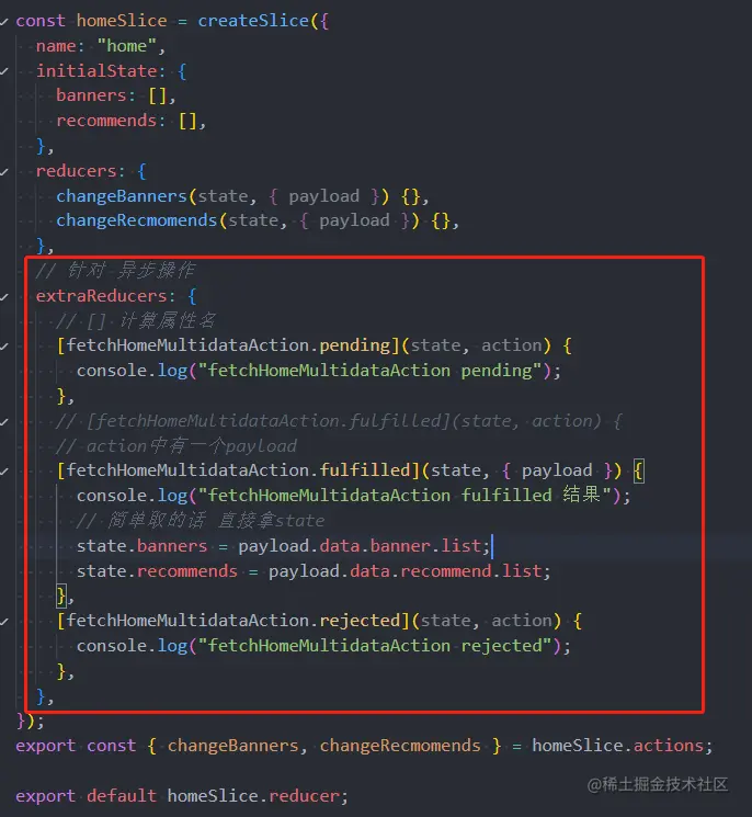 我们可以在createSlice的entraReducer中监听这些结果: