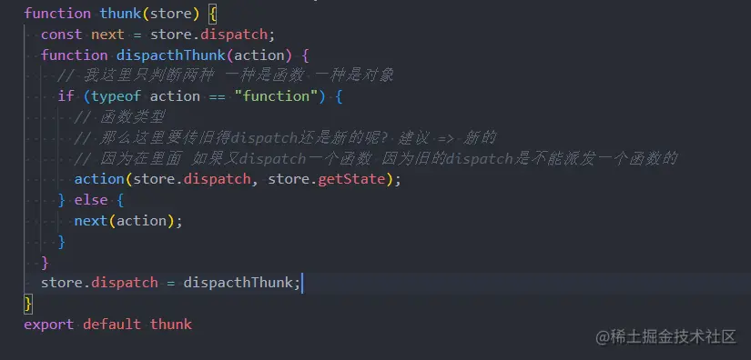 - 那么redux-thunk中的基本实现过程是怎么样的呢?事实上非常的简单。