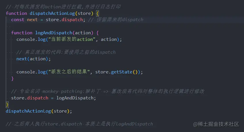 - 比如我们现在有一个需求,在dispatch之前,打印一下本次的action对象,dispatch完成之后可以打印一下最新的store state