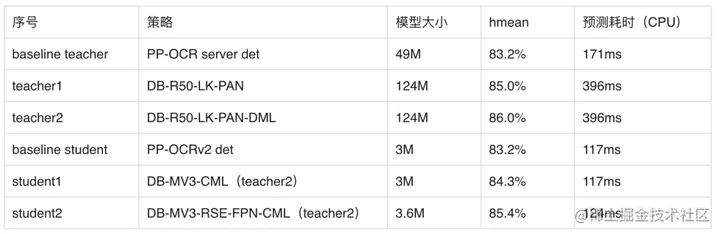 DML 互学习蒸馏方法,通过两个结构相同的模型互相学习,可以有效提升文本检测模型的精度。教师模型采用DML策略, hmean从85%提升到86%。将PP-OCRv2中CML的教师模型更新为上述更高精度的教师模型,学生模型的hmean可以进一步从83.2%提升到84.3%。