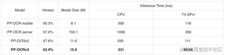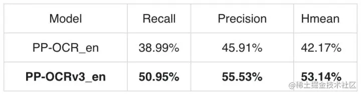 经过上述文本检测和文本识别9个方面的优化,最终PP-OCRv3在速度可比情况下,在中文场景端到端Hmean指标相比于PP-OCRv2提升5%,效果大幅提升。具体指标如下表所示: